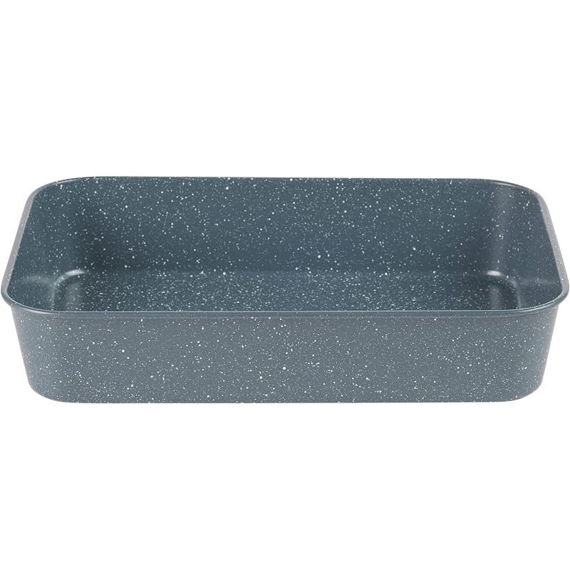 Тавата е изработена от въглеродна стомана, която осигурява дълготрайност и издръжливост. Тавата е с незалепващо мраморно покритие, което осигурява лесно почистване и предотвратява залепването на храната към повърхността й.