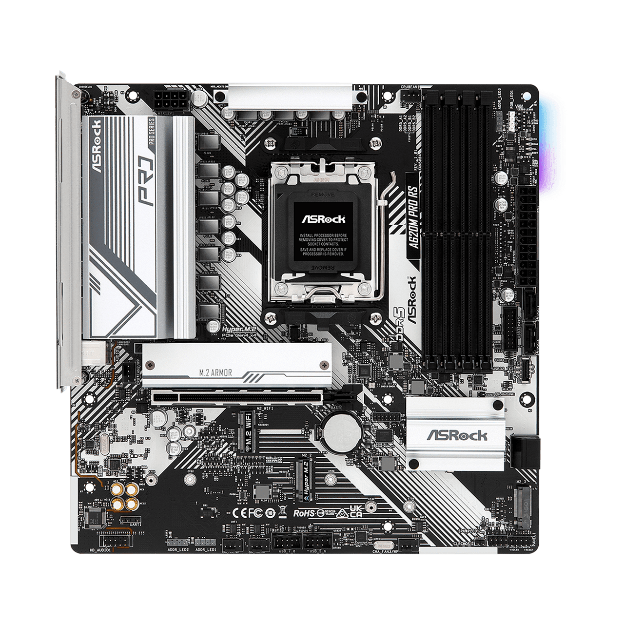 Дънната платка ASROCK A620M Pro RS, както е видно от изображенията, е създадена за потребители, които търсят модерно micro ATX решение, което отговаря на последните процесори на AMD и DDR5 памет, съчетано със съществени възможности за разширение и опции за свързаност, подходящи за широк спектър от приложения. Нейният дизайн интегрира практични функции с визуална привлекателност, насочени както към производителността, така и към конфигурации, където оптимизацията на пространството е от съществено значение.