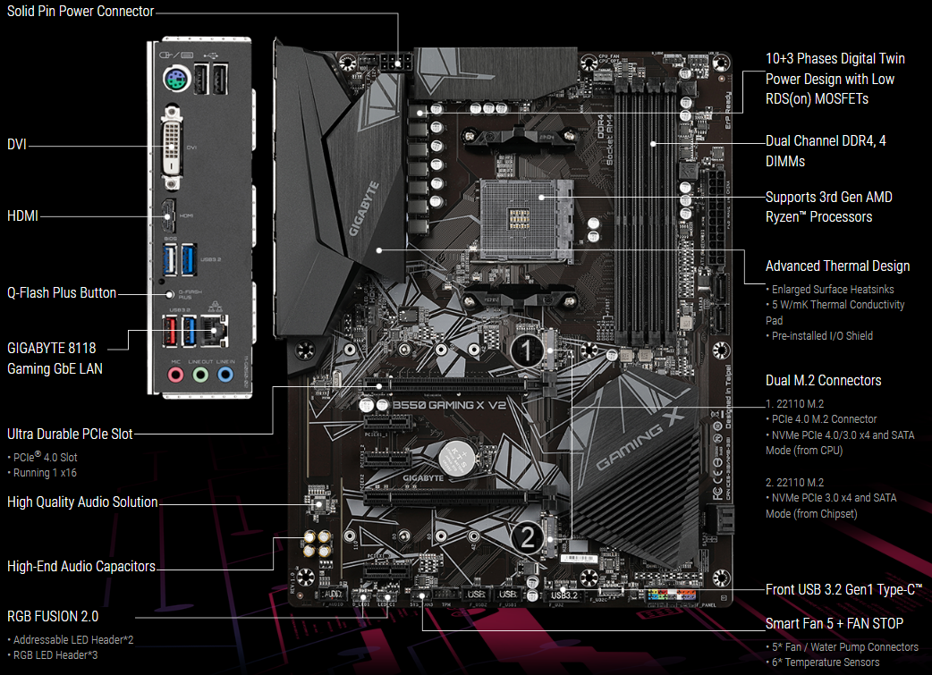 Dual NVMe PCIe 4.0*/3.0 M.2 Connectors With NVMe PCIe 4.0*/3.0 x4 and PCIe 3.0 x4 M.2 connectors onboard, GIGABYTE Motherboards bring users to experience NVMe mode or SATA mode connectivity for M.2 SSD devices. Delivering up to 64 Gb/s data transfer speed, the dual M.2 connectors design provides an ideal storage solution while also supporting in RAID modes. | ![]() |
