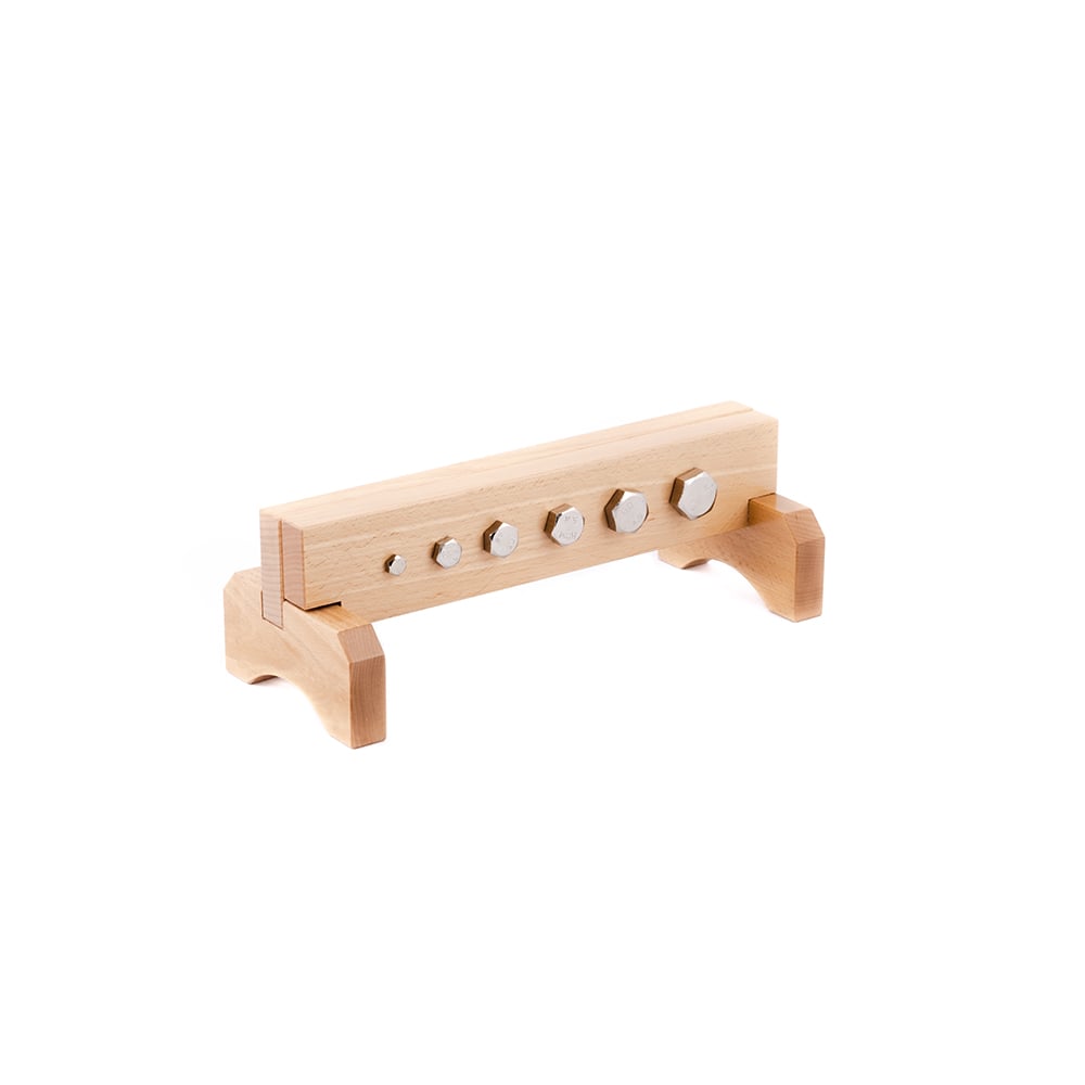 • Научаването на правилното използване на предметите от ежедневието е важна част от практическите житейски умения, а материалът с гайки и болтове е отличен начин за развитие на координацията между ръцете и очите и фините двигателни умения. Комплектът се състои от дървена рамка с размери 29.5 x 12 x 10 cm и друга дъска, всяка с шест различни по размер дупки в тях. Шест различни по размер двойки болта и гайки от неръждаема стомана трябва да бъдат съчетани и да се използват за закрепване на дъската към рамката. Това упражнение може да се направи само с ръце и не изисква никакви допълнителни инструменти.