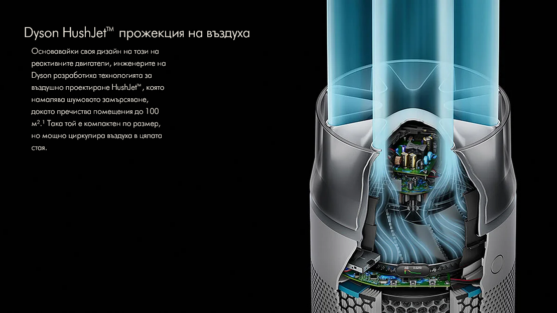 Основавайки своя дизайн на този на реактивните двигатели, инженерите на Dyson разработиха технологията за въздушно проектиране HushJet, която намалява шумовото замърсяване, докато пречиства помещения до 100 м. Така той е компактен по размер, но мощно циркулира въздуха в цялата стая.