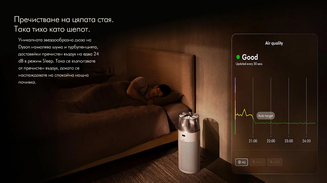 Уникалната звездообразна дюза на Dyson намалява шума и турбуленцията, доставяйки пречистен въздух на едва 24 dB в режим Sleep. Така се възползвате от пречистен въздух, докато се наслаждавате на спокойна нощна почивка.