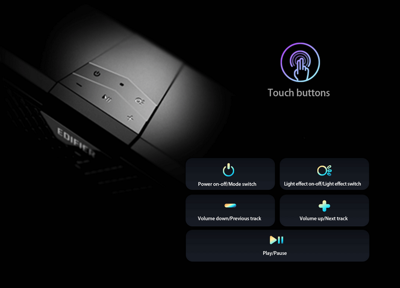 The touch control panel is mounted on the top. Touch with your fingertip to get full control With your touch, the light strip reacts instantly, indicating the current status of the speaker.