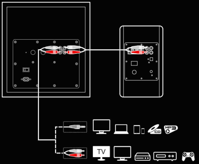 ![]() | Method 1: If the main speaker system has a subwoofer port, connect it to the Signal In ports on the subwoofer, then connect the main speaker system to the audio source. * Compatible EDIFIER speaker models: |