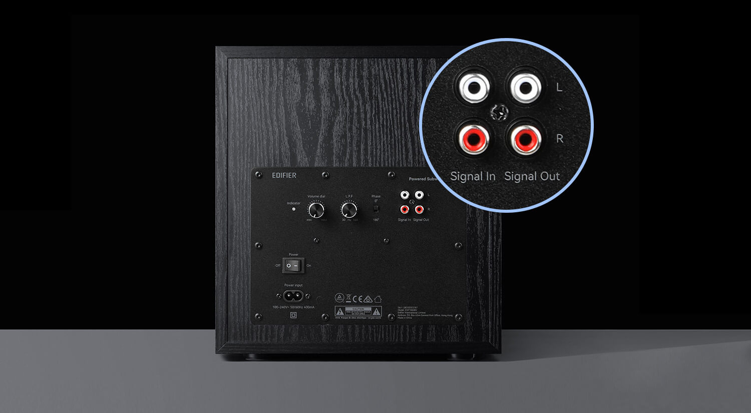 Signal In and Signal Out ports provide compatibility with desktop speakers, bookshelf speakers, and home theater receivers.