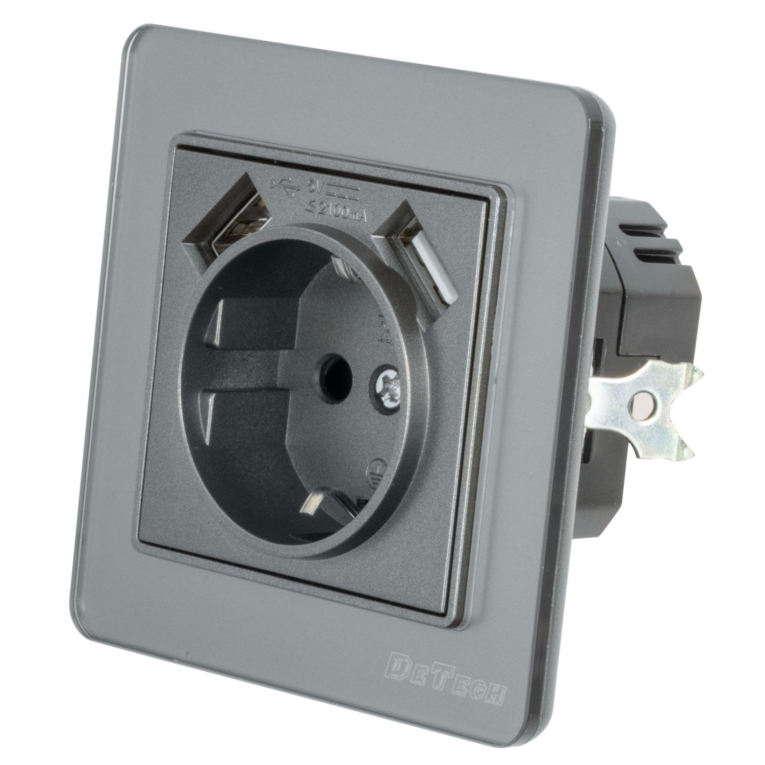 Единичен електрически контакт DeTech DE-6008-78 за вграждане, тип "Шуко", 2 USB изхода, със защита IP20.
