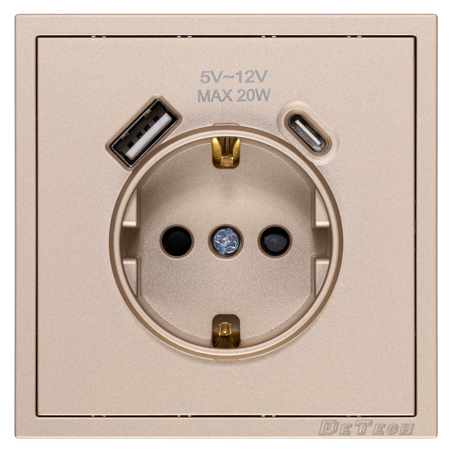 » Единичен електрически контакт DeTech DE-9227-80, 1xUSB-А, 1xUSB-C, Шуко, Мат, 16А, 250V, За вграждане, IP20, Златист - 75129