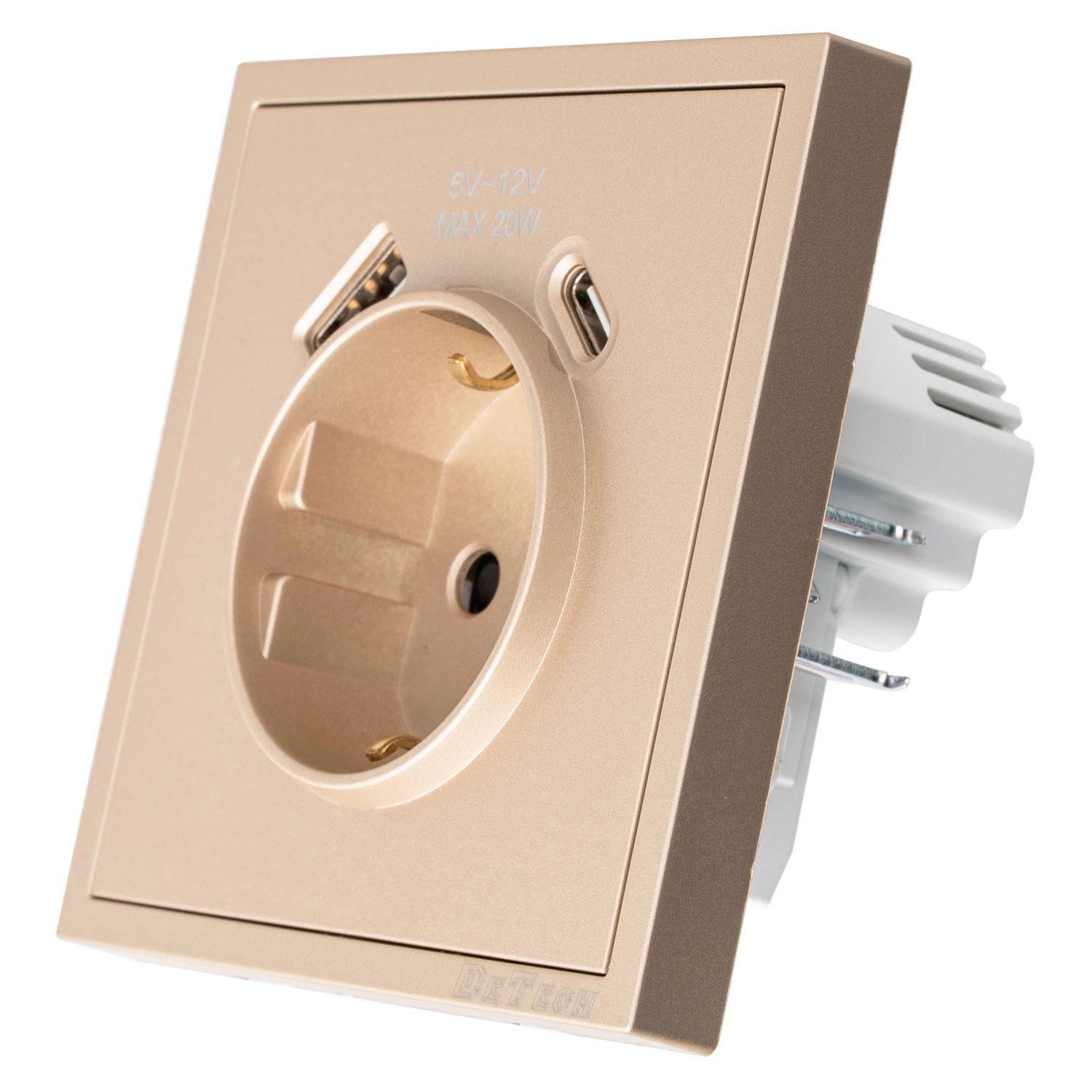 Единичен електрически контакт DeTech DE-9227-80 за вграждане, тип "Шуко", със защита IP20, с два изхода - 1xUSB-А, 1xUSB-C