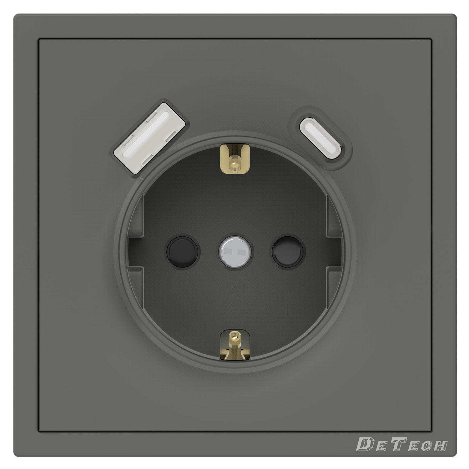 » Единичен електрически контакт DeTech DE-9227-80, 1xUSB-А, 1xUSB-C, Шуко, Мат, 16А, 250V, За вграждане, IP20, Сив - 75144
