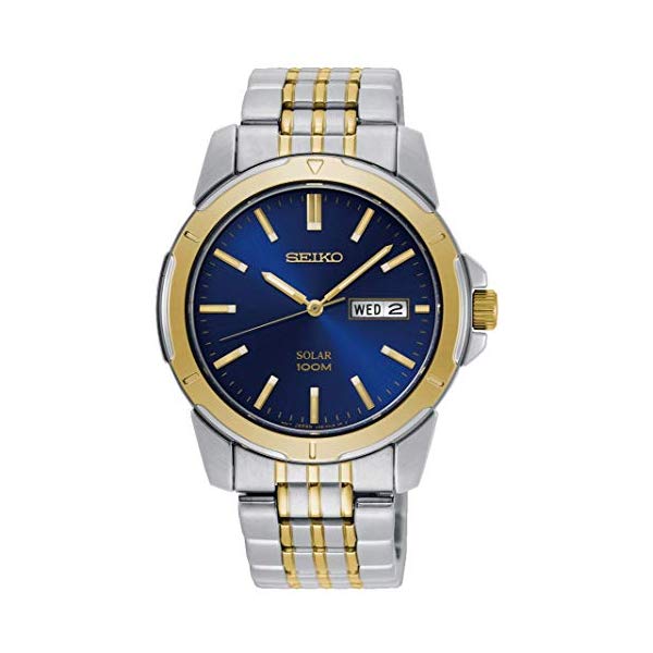 В класическа комбинация от неръждаема стомана и злато и елегантният син циферблат, отличаващ се със златисти рамки и детайли