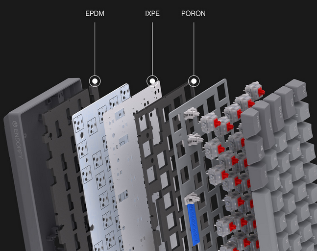 Hear the difference Our goal? A typing experience that feels as good as it sounds. That’s why the Thock V2 75% is lined with three layers of acoustic foam — PORON and EPDM as well as IXPE — to minimize echo and eliminate that hollow typing noise. Even the spacebar is dampened with silicone pads, giving you a clean, satisfying sound from Esc to right Enter. | ![]() |