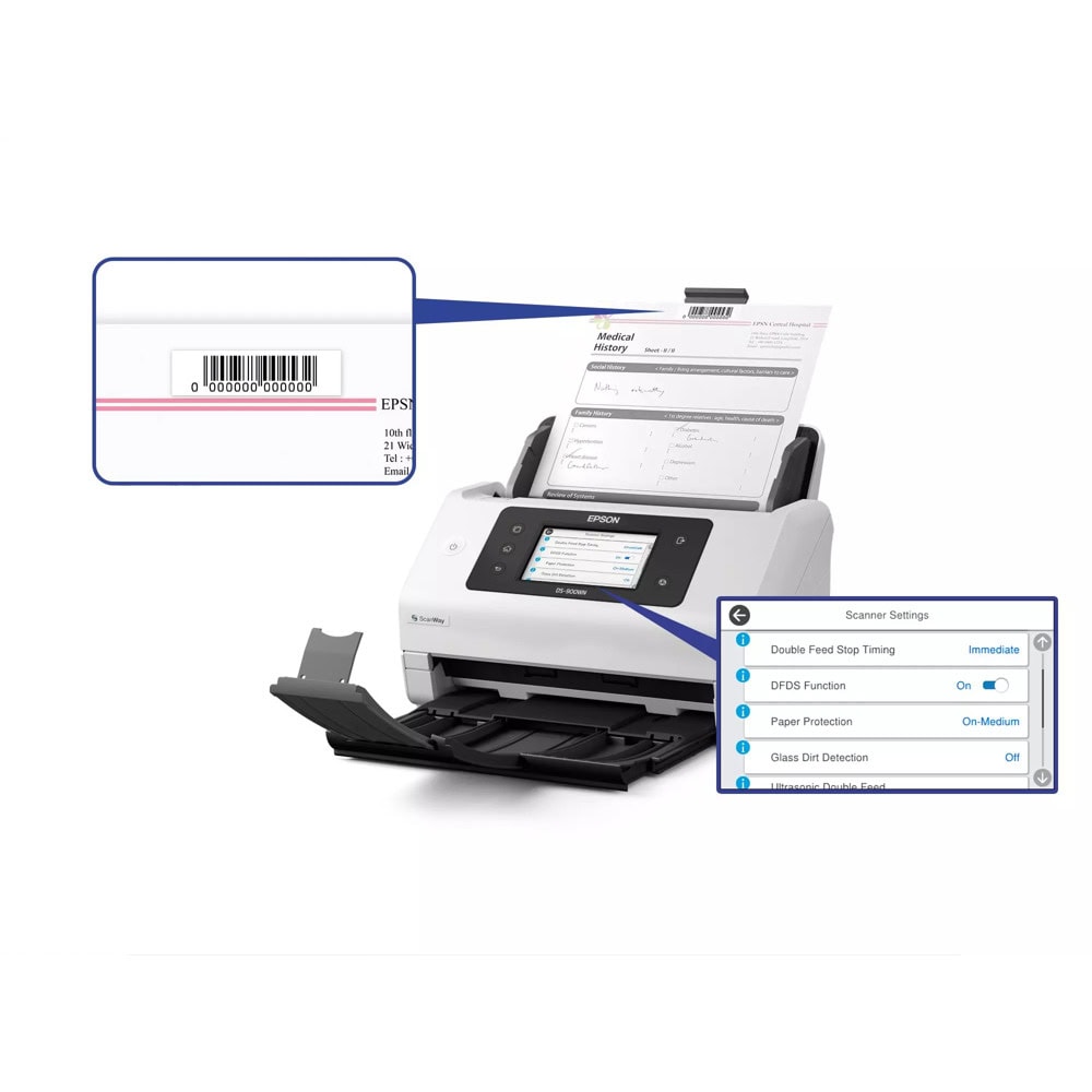 DS-900WN обработва и дигитализира голям обем документи, бързо и сигурно. Скоростите на печат от 70ppm/140ipm дневният работен цикъл от 11 000 страници и включената плоча за подравняване на хартията, правят този скенер идеален за широк спектър от промишлени сектори: от правителството, здравеопазването и правния сектор до финансите, счетоводството и образованието.