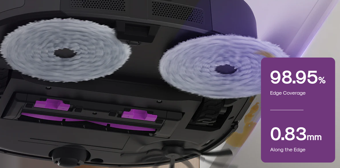 Eureka J15 Ultra is equipped with Eureka's self-developed mop extension technology, ScrubExtend. When encountering skirting boards, wall corners, and table legs, the mop extends outward for extreme '0-gap' edge cleaning. The extended mop achieves 98.95%* edge coverage with a precision margin of 1.36 mm* , certified by TÜV Rheinland, ensuring highly efficient corner cleaning and reduce manual secondary cleaning.