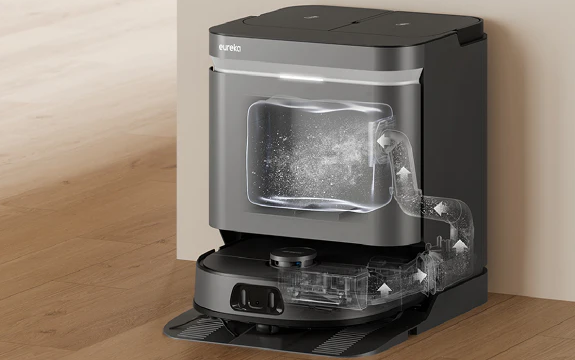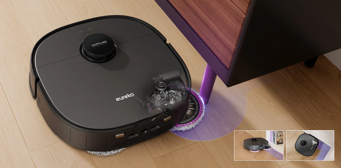 Eureka's exclusive ScrubExtend system avoids bumping into furniture or damaging the mopping arm's motor. An industry-first flexible swing arm design leverages the friction generated during mopping to extend and retract the mop. Combined with the cushioning effect of the mop's soft rubber edges, the motor effectively avoids obstacles in complex home environments, protecting both the gear and motor transmission mechanisms — as well as your furniture.