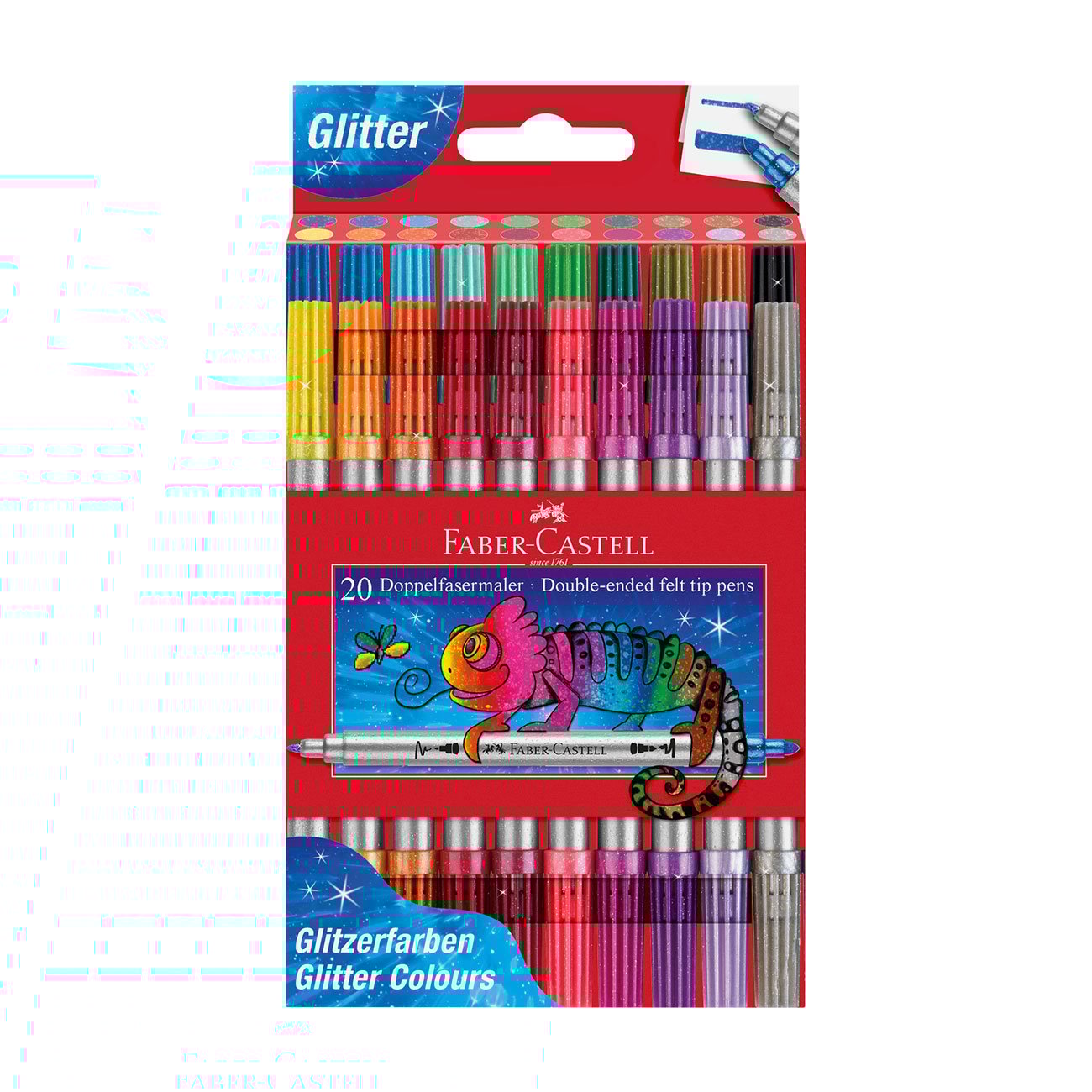 Двойните флумастери на Faber-Castell са в комплект от 20 цвята и добавят блясък и ефект към всеки творчески проект. Всеки флумастер разполага с два различни върха, което осигурява повече възможности за рисуване, декорации и акценти.