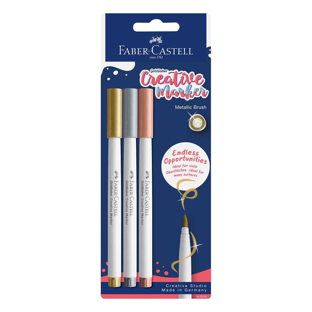 • Открийте магията на Goldfaber Creative – маркери с богати, блестящи нюанси, създадени за креативни проекти и декорации. С голям връх тип четка за променлива ширина на линията, тези маркери позволяват както изящни детайли, така и смели, артистични щрихи с металически ефект.