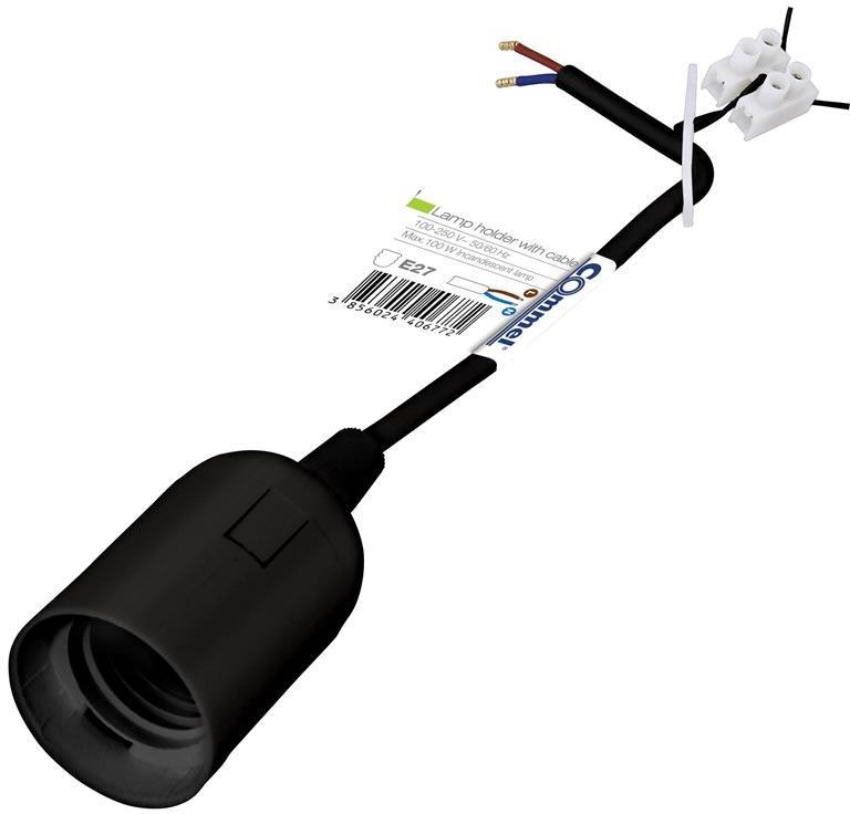 Фасунга E27 черна с кабел 17см. H03VV-F 2x0,75мм2 и клема, Commel