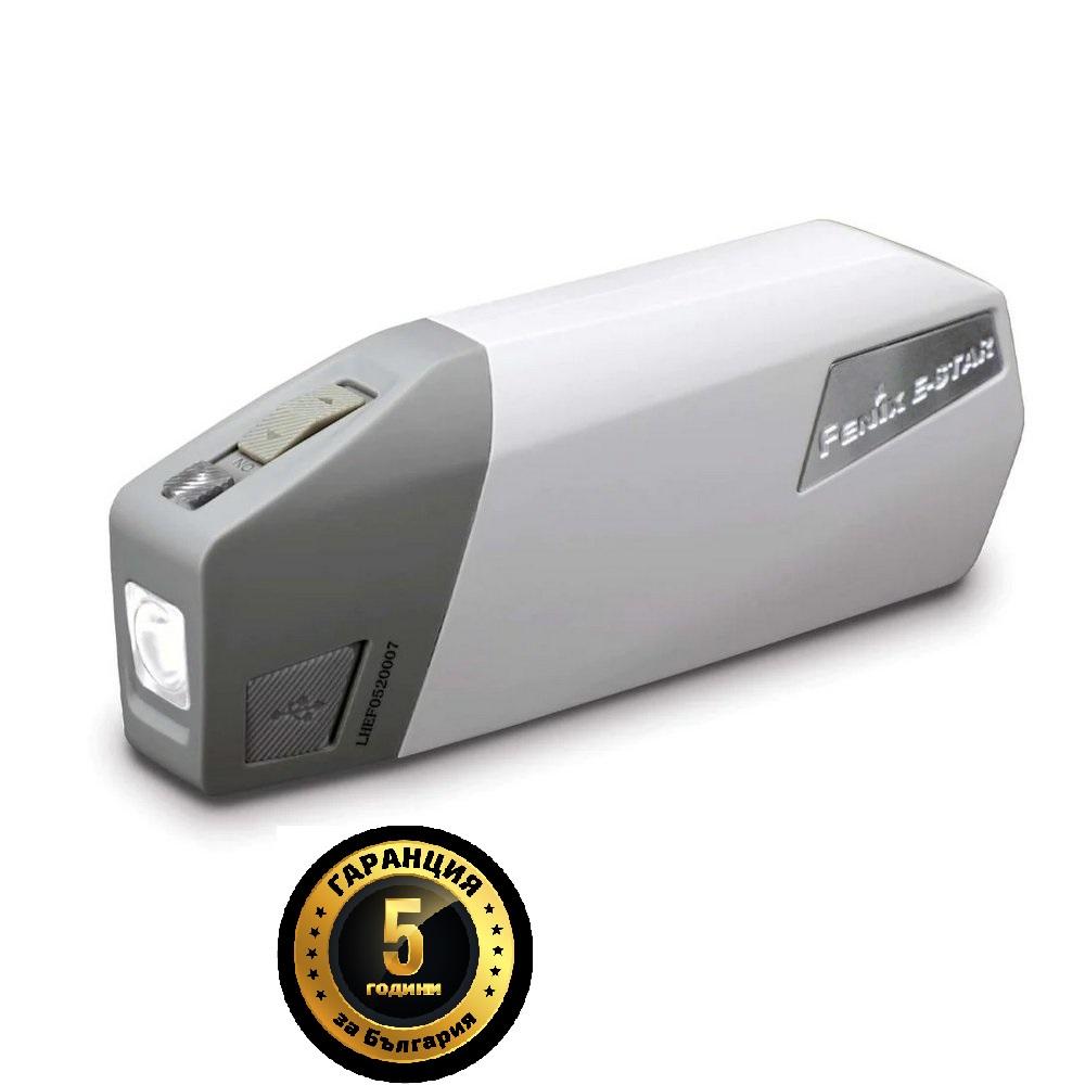 Аварийния фенер Fenix E-STAR се отличава с три нива на яркост и 100 лумена, които се захранват от включената Ni-MH батерия с капацитет 1300 mAh или без батерия. Заредете батерията, като я включите към USB източник на захранване или просто натиснете лоста за зареждане. Този лост активира вграден суперкондензатор за буфериране на електрическа енергия, който може да осигури непрекъснато осветление дори без батерия и не е необходимо да се поддържа чрез постоянно натискане. E-STAR е идеалният инструмент, който може да имате в готовност и никога да не се притеснявате за това "дали" батерията е заредена.