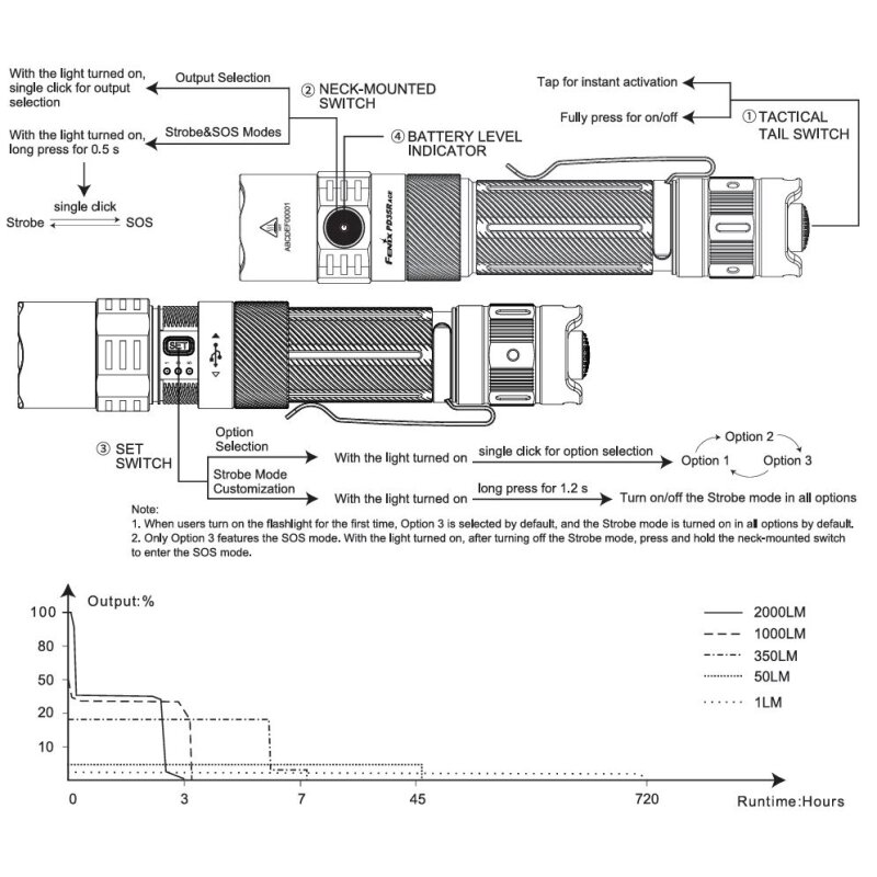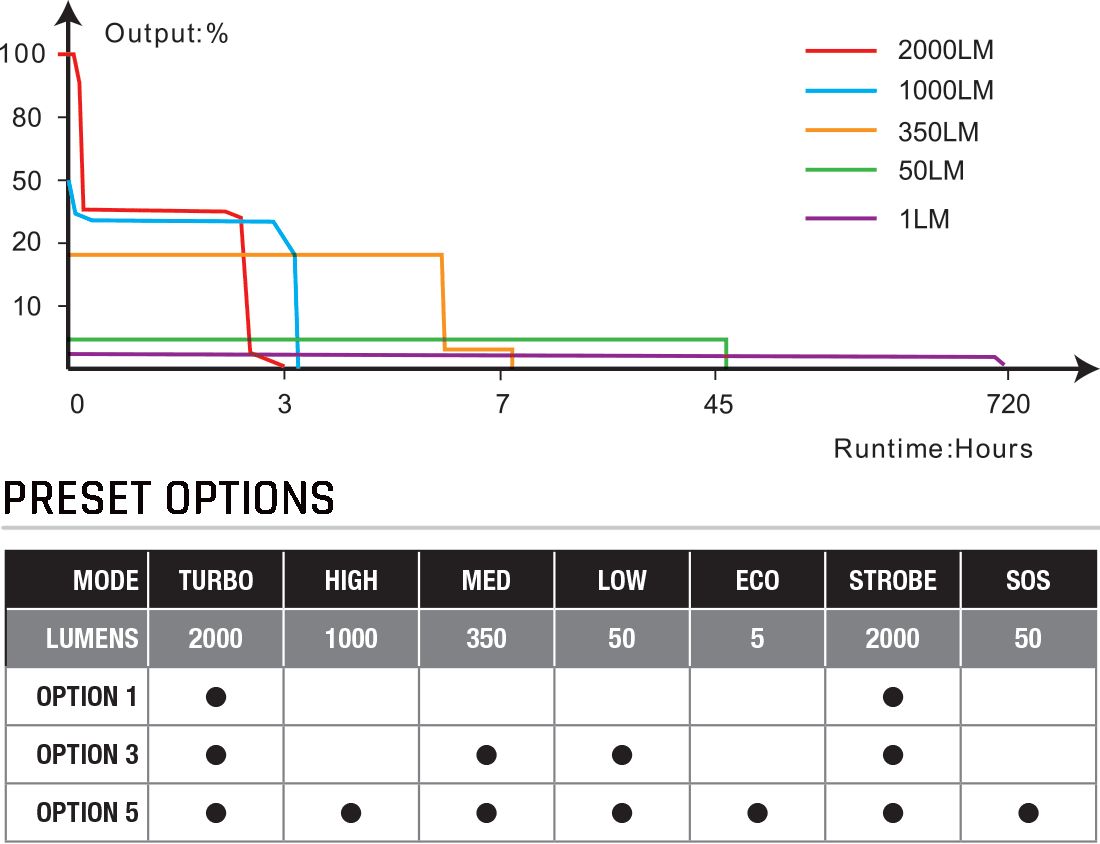 - Режими на осветяване: 7 режима на осветяване, включително 6 нива на яркост и стробоскоп; шест предварително зададени опции