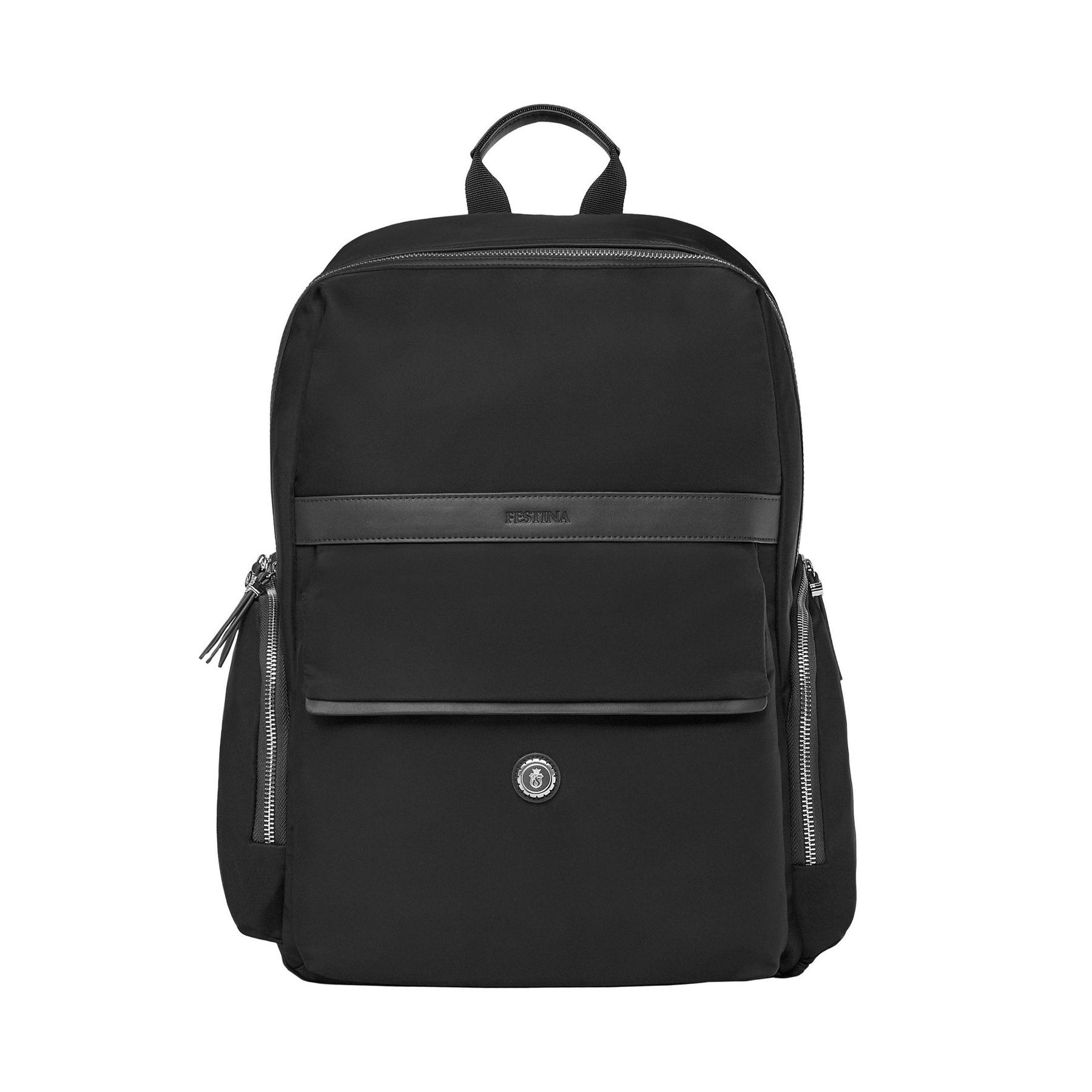 Раницата Festina Button е изработена от гладък полиестер с текстурирани кантове. Хромираните акценти и луксозни метални детайли придават елегантен завършек, но с нотки небрежна естетика.