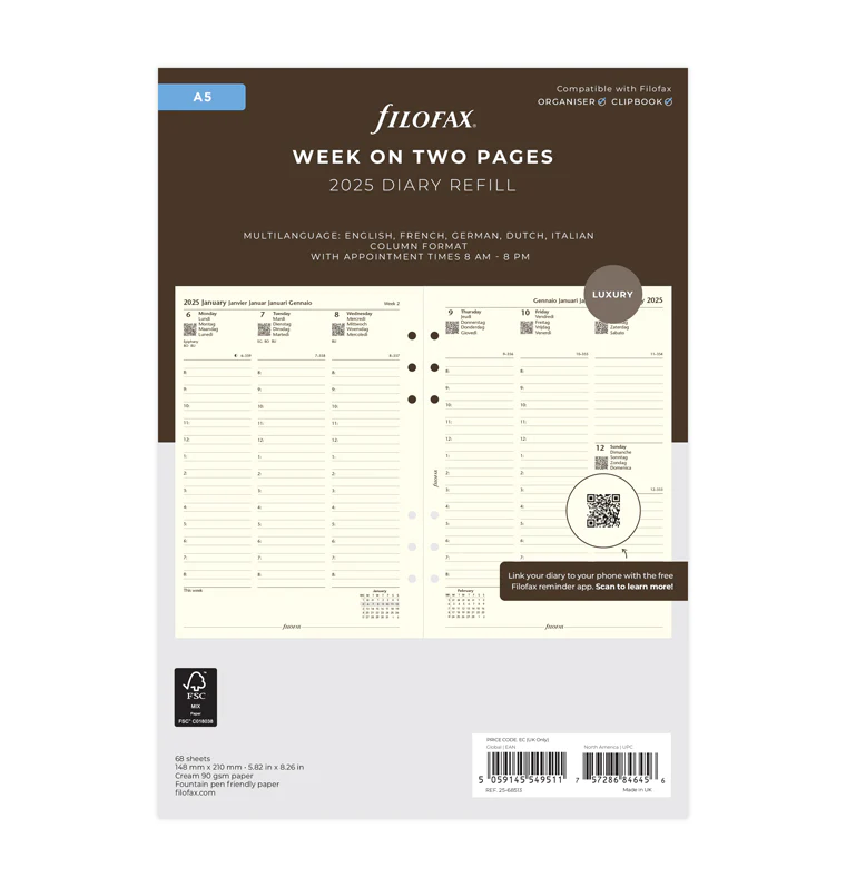 Filofax Пълнител за органайзер, A5, за 2025 година, 1 седмица на 2 страници, кремав