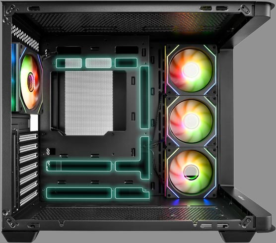 | Fan&Water Cooler Support | Side: 120mm x 3 or 140mm x 2 Top: 120mm x 3 or 140mm x 2 or 360mm Radiator Bottom: 120mm x 3 or 360mm Radiator Rear: 120mm x 1 |