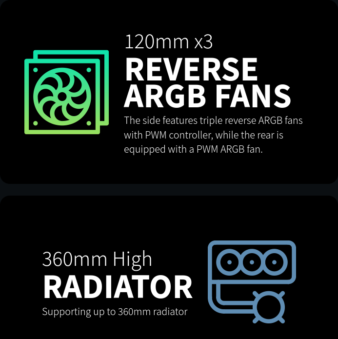 | Fan Including(Pre-installed) | Side:120mm reverse PWM ARGB x 3 with PWM controller Rear:120mm PWM ARGB x 1 ***Press and hold the RGB button to switch to sync mode. |