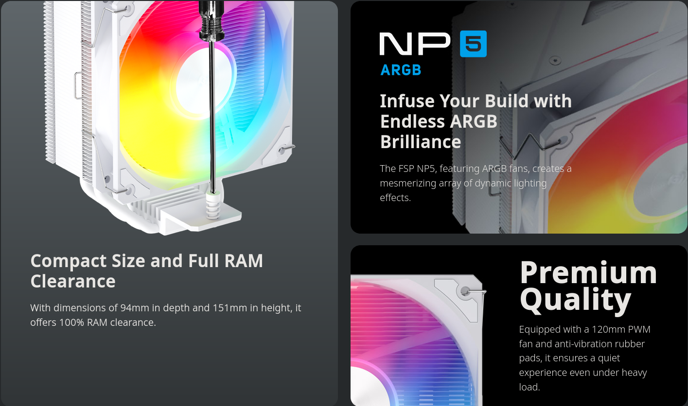| CPU Supported Platforms | Intel LGA : 1851 / 1700 / 1200 (The installation method for 1851 is the same as for 1700) AMD : AM4 / AM5 |