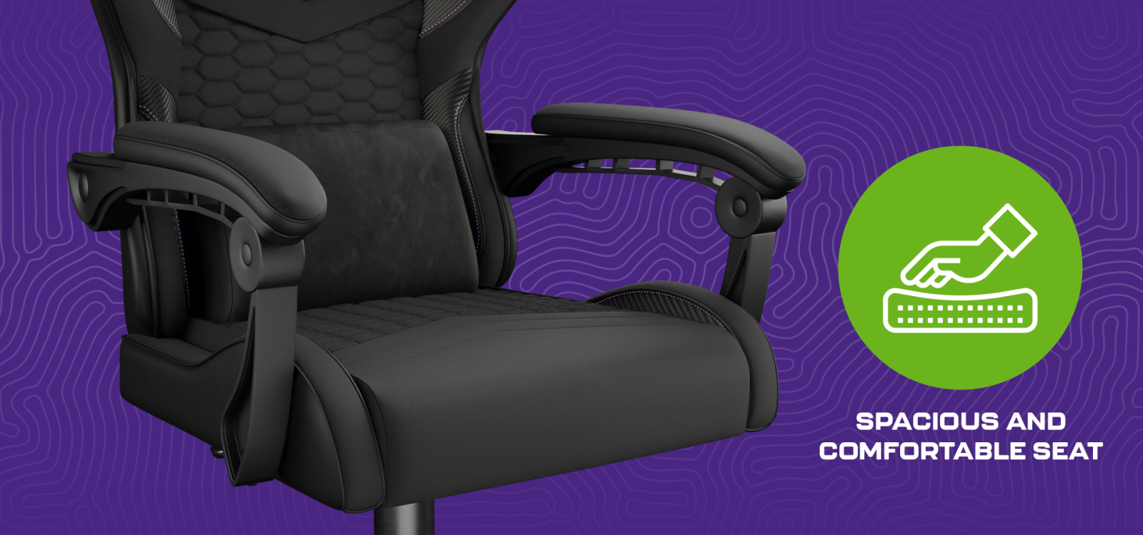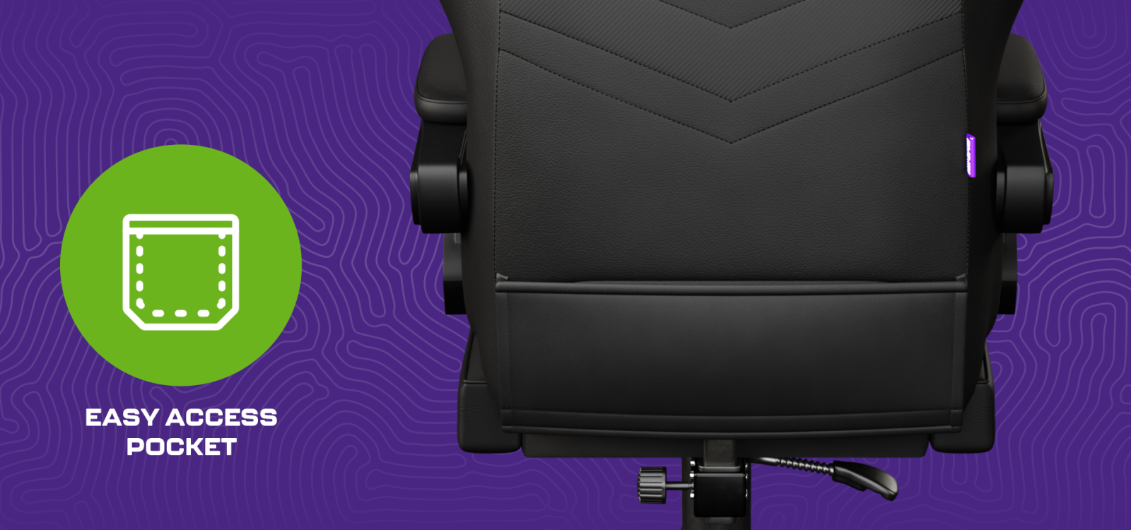 On the back of the seat you will find a practical pocket that serves as a storage compartment for accessories and small items. Remote control, headphones, notes? Everything you need at hand, not in the farthest corners of your desk. A tidy setup means more control over your game.