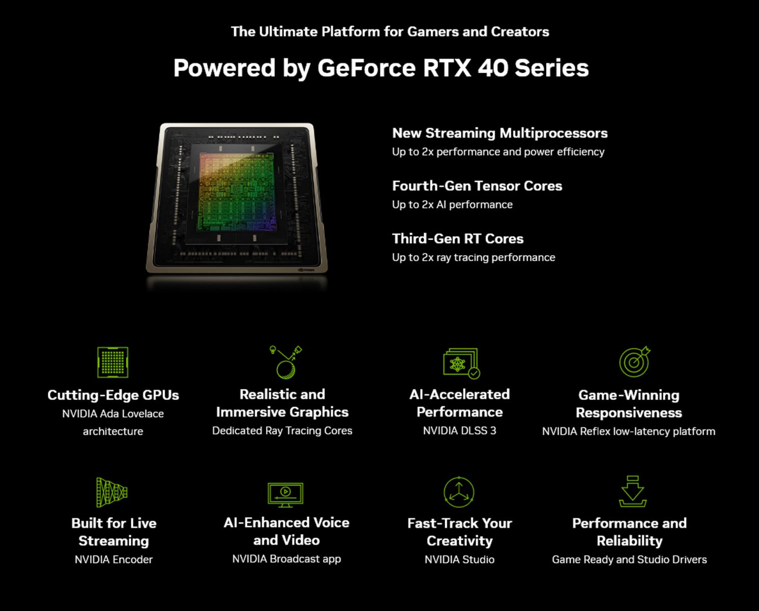 Ray Tracing The Ada architecture unleashes the full glory of ray tracing, which simulates how light behaves in the real world. With the power of RTX 40 Series and third-gen RT Cores, you can experience incredibly detailed virtual worlds like never before. |