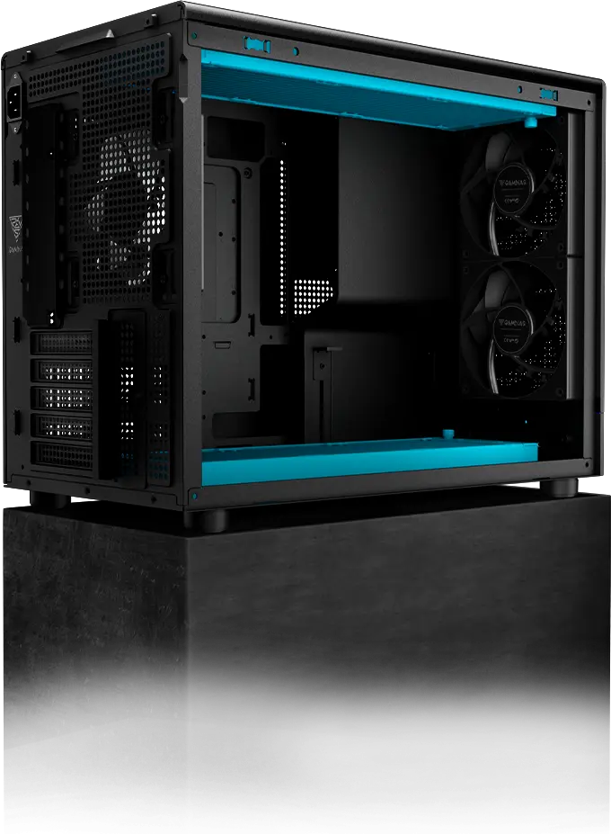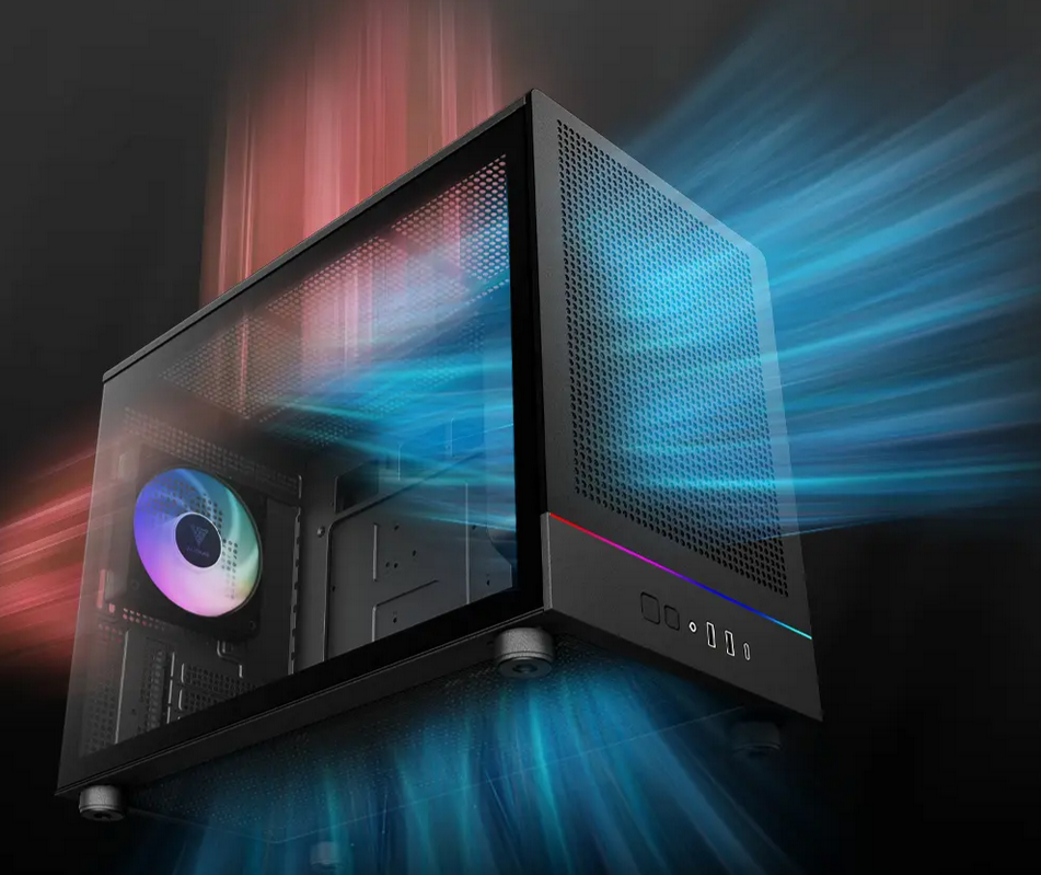 The ATHENA M4M is a compact micro-tower case engineered for performance and style, featuring a fully perforated mesh front panel, a dynamic RGB lighting strip, and three built-in 120mm NOTUS M1 fans for optimized airflow. It supports dual 360mm radiators, BTF motherboards, and GPUs up to 395mm, offering advanced compatibility and standout thermal performance in a space-efficient design, making it an ideal choice for high-performance compact builds.