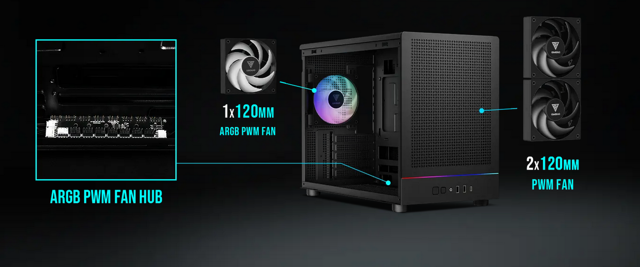 Featuring three built-in silent NOTUS M1 fans, the case provides exceptional lighting and finely tuned airflow with minimal noise. The included 8-port PWM ARGB fan hub allows for easy management and synchronization, ensuring a cohesive lighting setup that perfectly complements the high-performance, quiet operation of the fans.