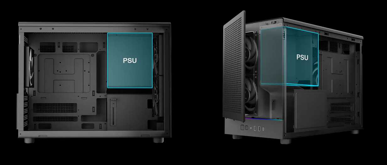 The PSU is strategically positioned at the front side of the case, with connector ports oriented downward for easier cable management. A PSU shroud enhances the clean aesthetic, and an extension cable is included to facilitate rear power connection.