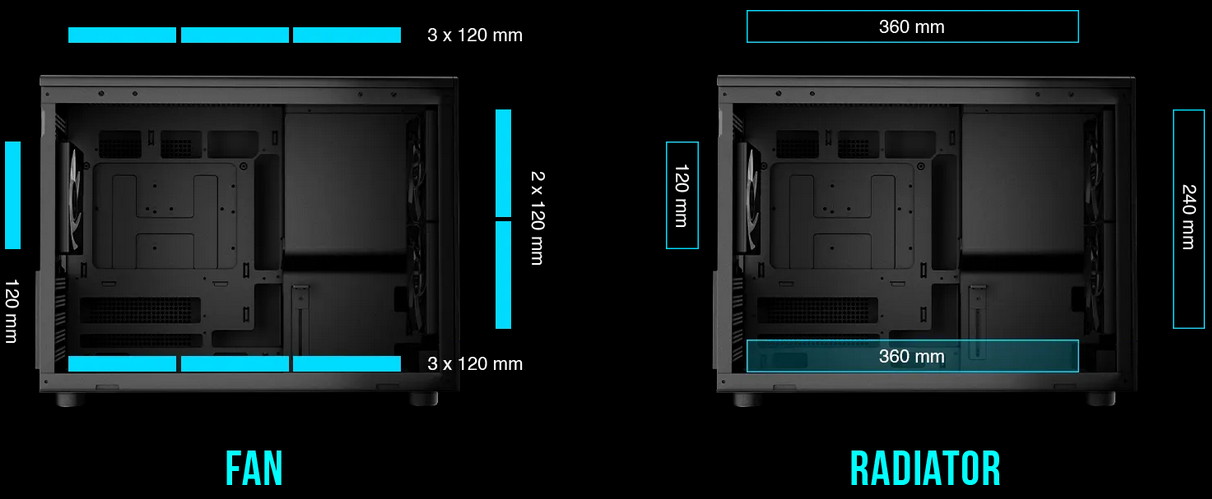 DUAL 360MM RADIATOR SUPPORT The ATHENA M4M provides superior cooling performance as it can support 360mm radiators on the top and the bottom simultaneously. | ![]() |
