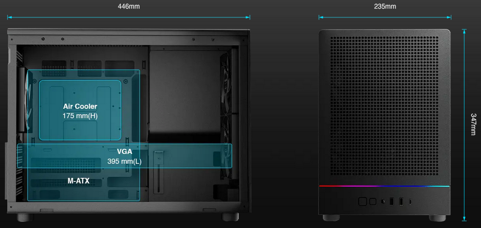 Designed with a compact form factor, the case offers the option to house up to m-ATX motherboards and VGA cards up to 395mm.