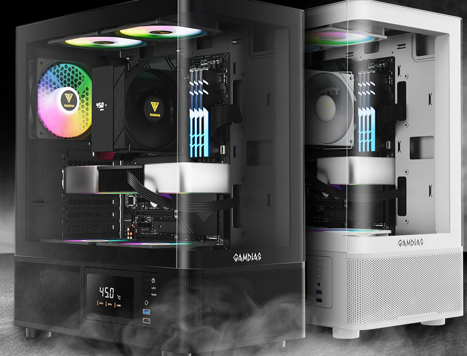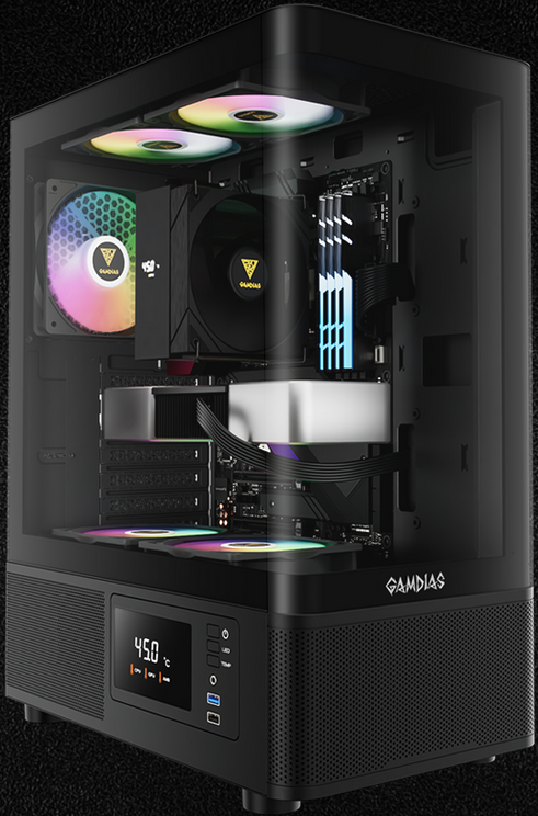 The ATLAS E2 CG Series is available in black and white editions. The case features perforated air vents with three built-in ARGB fans for optimal airflow and a customizable monitor for real-time system information. Enjoy the benefit of curved seamless tempered glass design, providing stunning visuals of your build from every angle.