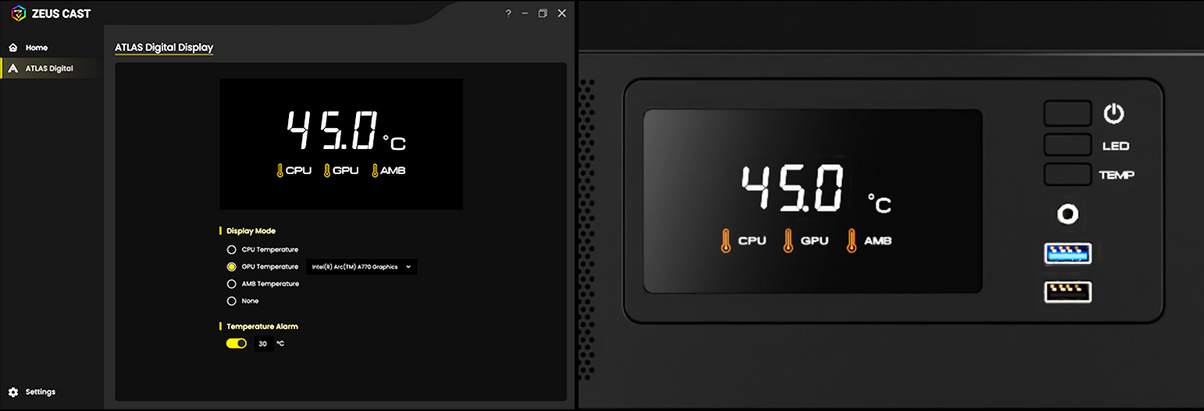 The embedded monitor displays real-time system information including CPU, GPU, and ambient temperature, adjustable via ZEUS CAST software. Users can also switch between modes through the I/O panel.