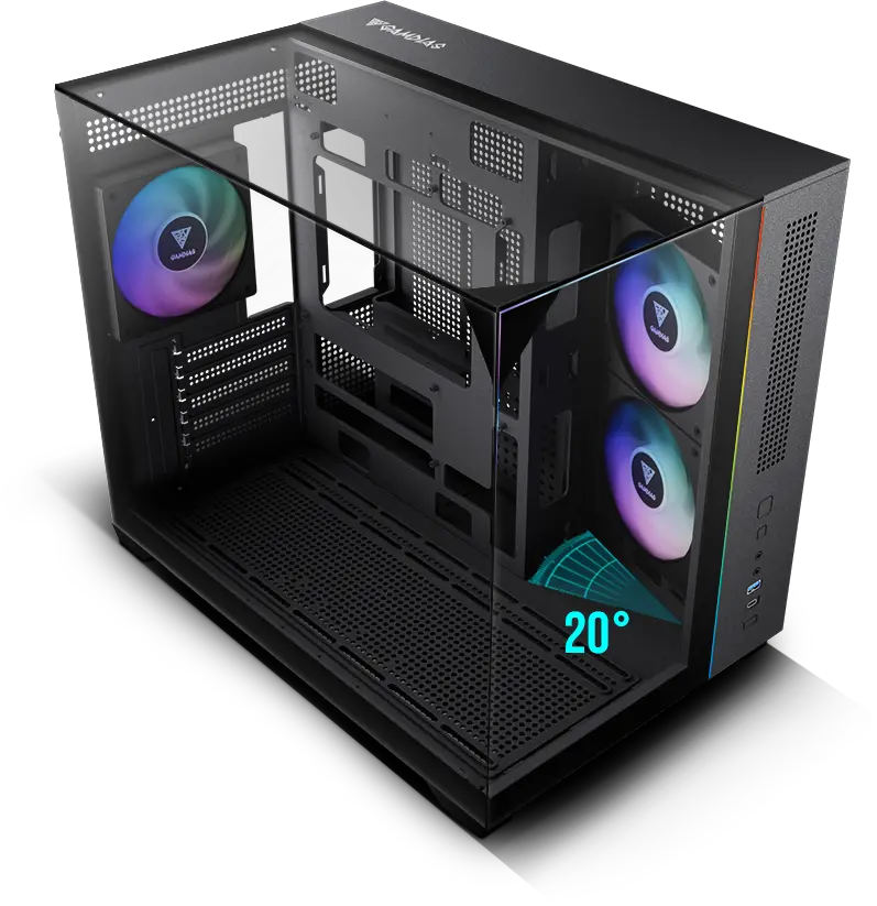 ANGLED AIRFLOW DESIGN A unique angled fan mounting system channels airflow directly toward high-end GPUs, maintaining optimal temperatures during intensive gaming. This thoughtful design ensures your graphics card runs more efficiently, even under maximum load. | ![]() |