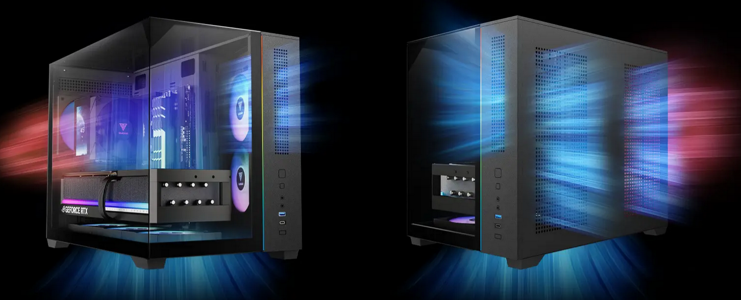 Designed with a compact form factor, the case offers the option to house up to m-ATX motherboards and VGA cards up to 400mm, including support for RTX 50 Series GPUs.