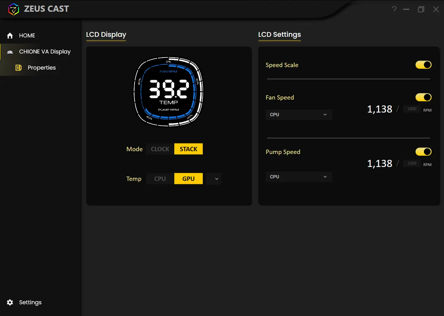 The intuitive ZEUS CAST software allows you to customize display mode, temperature units, set up the highest fan and pump speeds, as well as disable the speed scale.