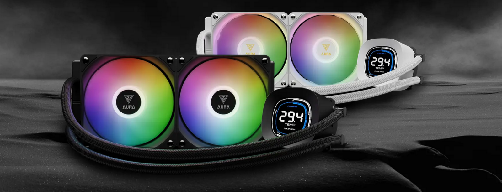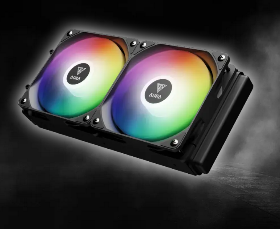 The AURA GL240 DIGITAL is a digital display ARGB liquid cooler equipped with a powerful motor, an upgraded copper base, and an optimized fluid routing system for reliable performance. Its 2.1-inch screen on the water block provides real-time stats, displaying CPU temperature, fan speed, and pump speed for seamless system monitoring.
