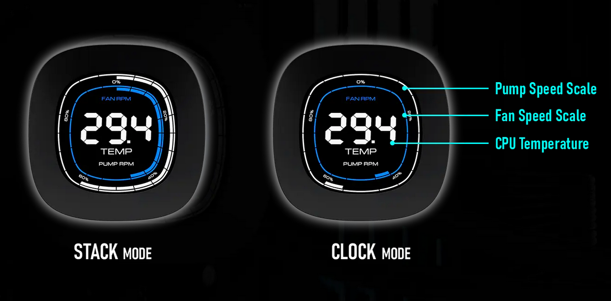 The 2.1" digital screen integrated into the water block displays the CPU temperature, fan speed, and pump speed scales to monitor essential system status in real time. The ZEUS CAST software enables full customization of charts and temperature unit displays (°C/°F).