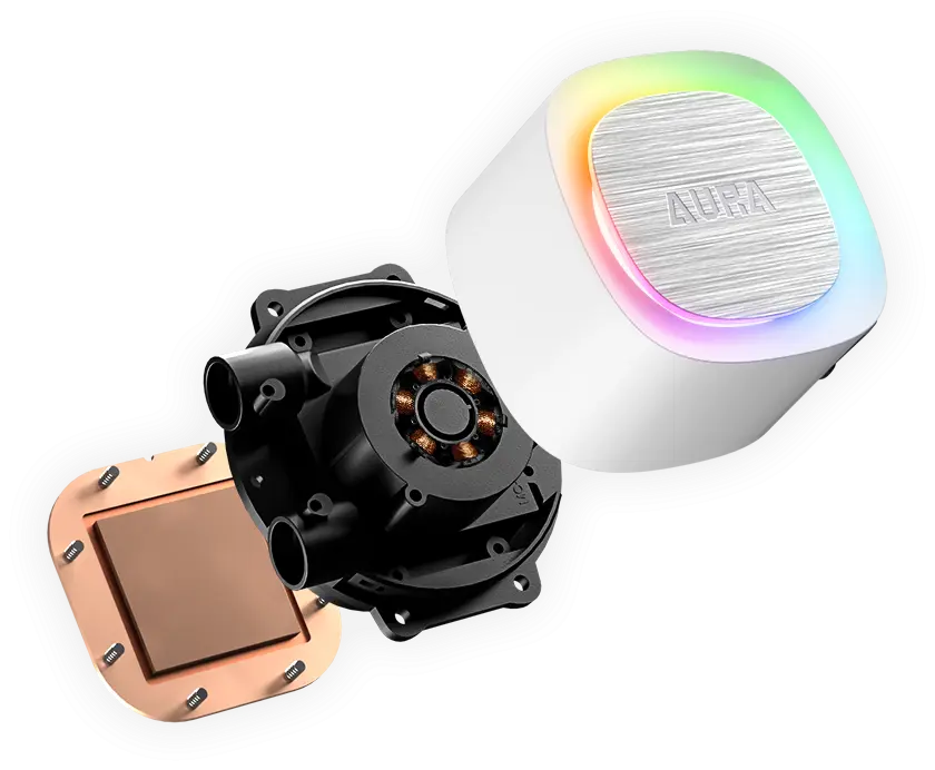 ![]() | Powerful and silent With an upgraded copper base, the thermal impedance between the CPU and the cold plate is reduced to enhance cooling performance. The optimized fluid routing system and powerful motor ensure stable pump speed and strong circulation in quiet operation to keep the copper base cool continuously. |