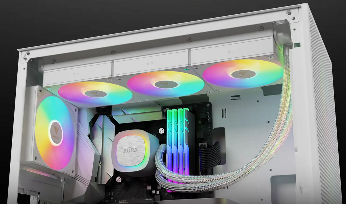 AURA GL360 V2 Series is available in black and white editions. With its powerful motor, upgraded copper base, and optimal fluid routing system, the cooler boasts top-tier in-class performance. The cooler also features hidden cable routing, a fully rotatable pump housing with brushed plating, a pump head with indirect lighting, and 30 built-in lighting effects.