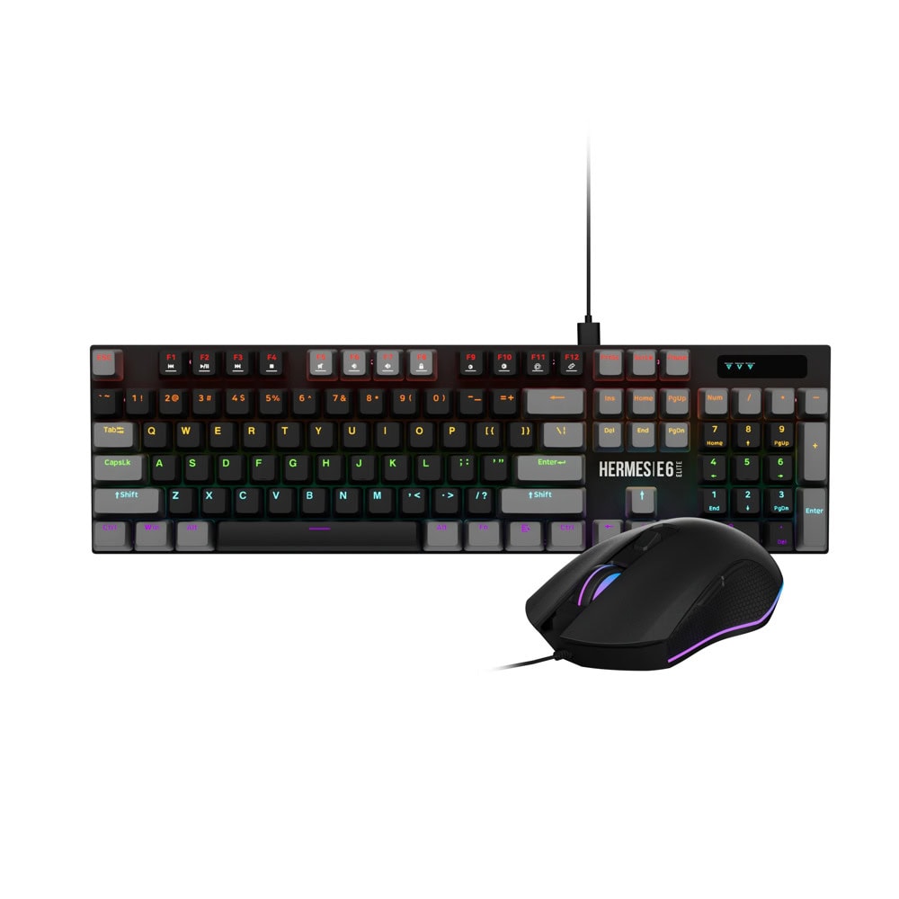 The HERMES E6 2-IN-1 COMBO showcases a sleek mechanical keyboard equipped with durable, all-black keycaps enhanced by vibrant lighting. Paired with a 3600 DPI ergonomic gaming mouse, this combo is meticulously crafted to meet the diverse demands of gamers, providing a decisive advantage over competitors.