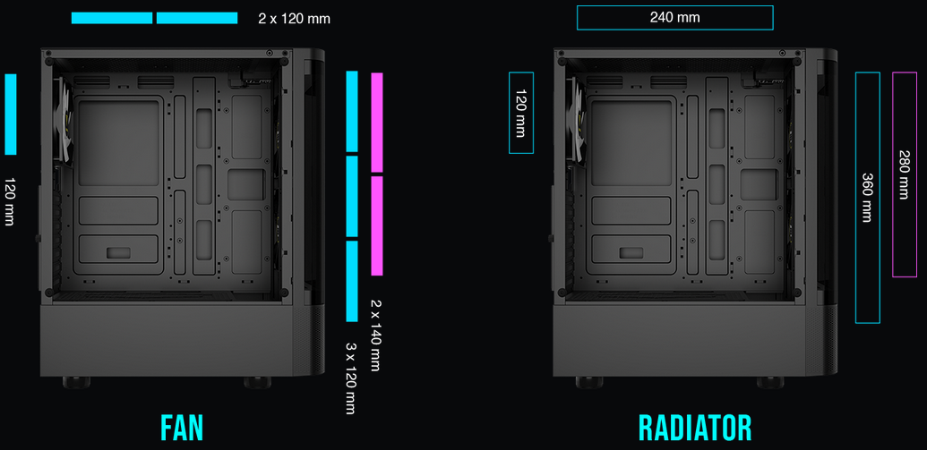 TALOS E3 CG supports three 120mm or two 140mm fans up front. Multiple mounting points for 360/280/240mm radiators up front, and 240/120mm radiator at the top.