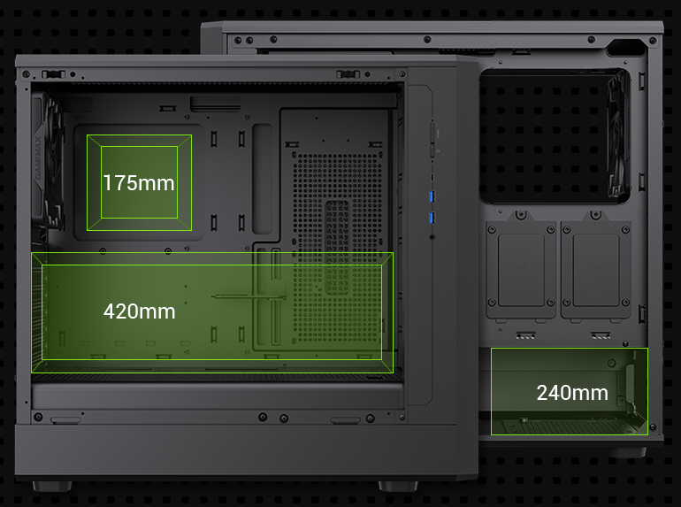 | VGA Support: | up to 420mm (inside the front cover w/o fan) | |