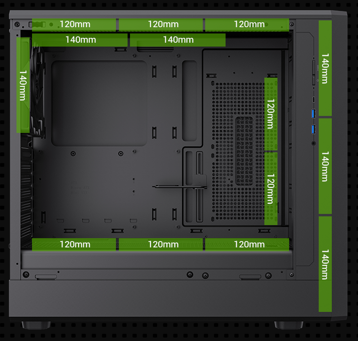 | Top: | 3x120mm ,2x140mm (Fan optional) | |