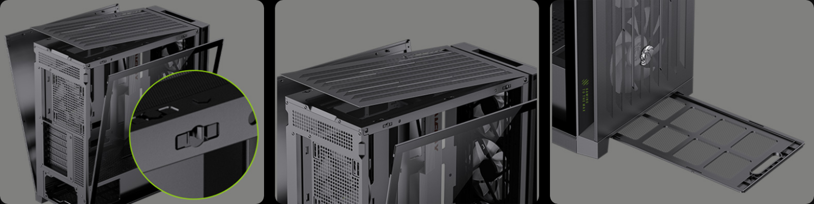 Efficient cooling airflow Supports both air and liquid cooling with excellent performance. Features a separated power supply compartment for efficient cooling. Vertical airflow channel quickly dissipates heat, ensuring stable computer operation. | ![]() |