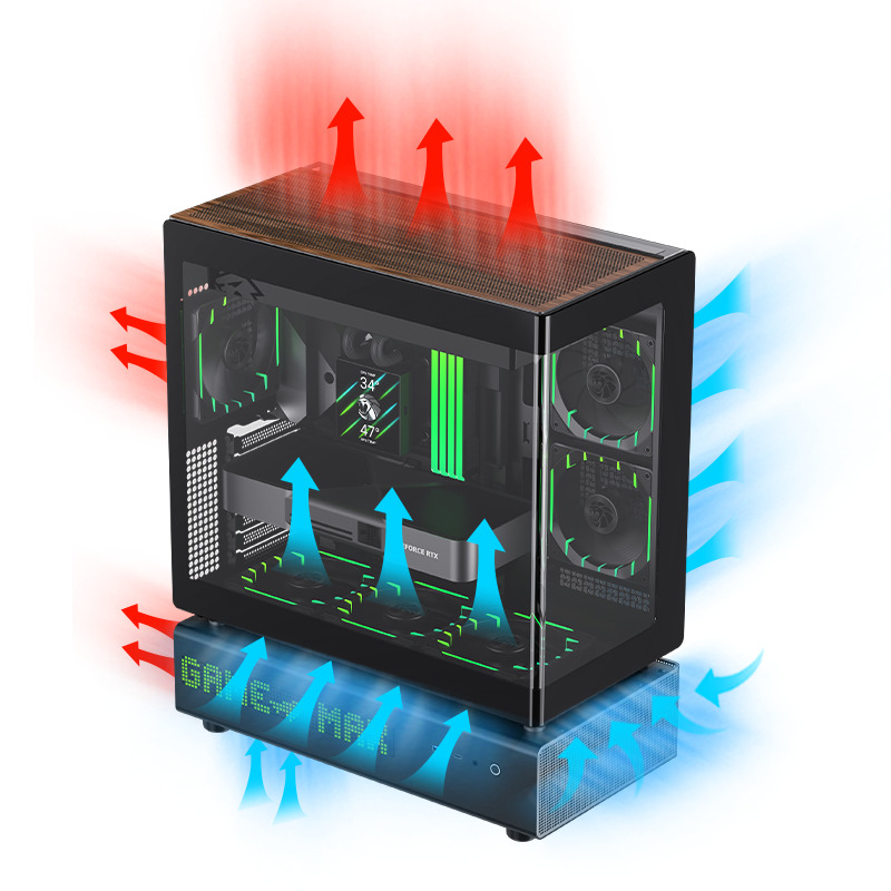 Advanced 270° cooling layout Air intake is positioned on the right side and bottom, with exhaust at the top and rear. The floating structure provides the bottom fan with an independent intake channel, delivering cool air directly to the graphics card for exceptional cooling performance. | ![]() |